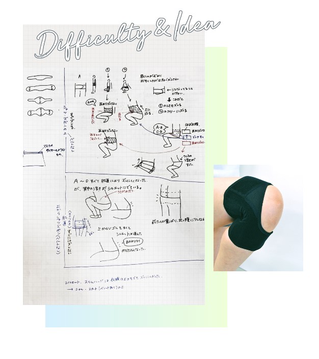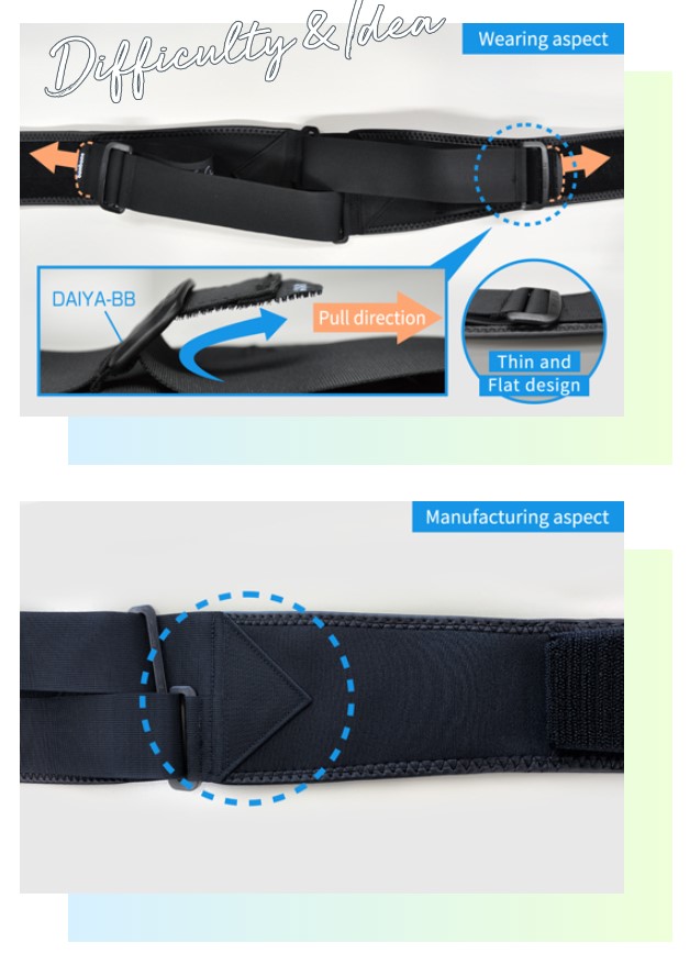 ในขณะที่คอร์เซ็ตและซัพพอร์ตต่างๆ มีจำหน่ายในท้องตลาด เราได้พิจารณาถึงการผลิตที่เป็นเอกลักษณ์ของ Daiya Industry และตัดสินใจที่จะเริ่มการพัฒนาตั้งแต่เริ่มต้นโดยการตรวจสอบวัสดุและส่วนประกอบที่เราใช้ในคอร์เซ็ตและซัพพอร์ตของเราเราได้สัมภาษณ์ผู้ผลิตวัสดุเพื่อค้นหาวัสดุใหม่ๆ ในขณะเดียวกันก็ซื้อชิ้นส่วนจากร้านดอลล่าร์และโฮมเซ็นเตอร์ และหารือเกี่ยวกับโครงสร้างของพวกเขา เราทำตัวอย่างซ้ำๆ และลองทำสิ่งต่างๆ ในบรรดาสิ่งเหล่านี้ เราสังเกตเห็นว่าการทำงานลดลงเมื่อสวมใส่เป็นเวลานาน ทั้งนี้ขึ้นอยู่กับรูปร่างและการเคลื่อนไหวที่เฉพาะเจาะจง การทำงานที่เสื่อมลงนี้เกิดจากความ "พอดี" เมื่อหมอบ เห็นได้ชัดโดยเฉพาะกับคนรูปร่างผอมบาง ในการสำรวจวัสดุรัดตัวสำหรับผู้บริโภคทั่วไป "การวางแนวไม่ตรงตำแหน่ง" เป็นสาเหตุหลักของปัญหาการทำงาน จากนี้ เราตัดสินใจเลือกหัวข้อ "การไล่ตามผู้สนับสนุนรัดตัวที่รักษาความพอดี"